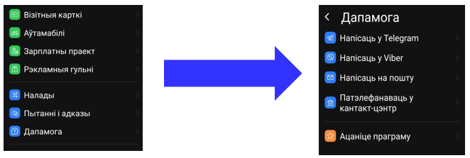 Спасылкі на названыя каналы размяшчаюцца ў самым дадатку ў раздзеле Мой профіль-Дапамога.