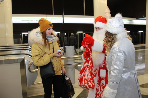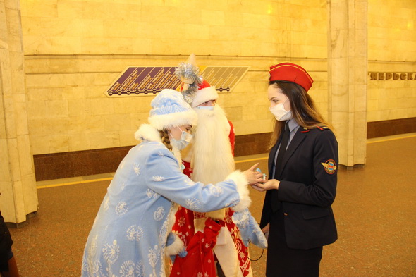 Сказочные дедушка и внучка начали свой путь со станции «Площадь Ленина». На своем пути они заглядывали в гости к билетным кассирам, дежурным поста централизации, поздравляли с наступающими праздниками инспекторов службы безопасности, специалистов по комплексной уборке помещений и других сотрудников на станциях, угощали их сладостями.