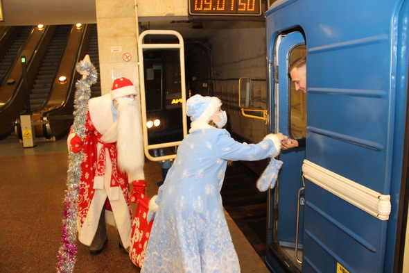 30 и 31 декабря на станциях Московской, Автозаводской и Зеленолужской линий Минского метрополитена было организовано новогоднее поздравление пассажиров и сотрудников подземки Дедом Морозом и Снегурочкой. В их роли выступили штатные работники метрополитена.