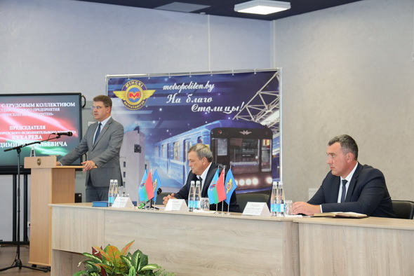 28 июля председатель Минского городского исполнительного комитета Владимир Кухарев встретился с трудовым коллективом государственного предприятия «Минский метрополитен». Участие в этом мероприятии также принял первый заместитель главы администрации Московского района города Минска Сергей Рубанов.