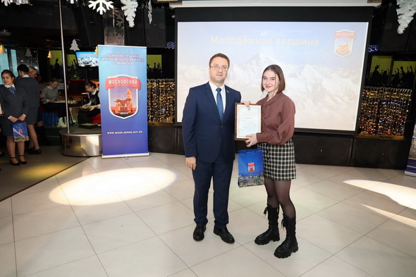 14 декабря в столичном клубе «Титан» состоялось подведение итогов работы сотрудников предприятий и организаций Московского района по реализации государственной молодежной политики. В рамках этого мероприятия состоялось награждение номинантов конкурса «Молодежная вершина». Для молодых людей была подготовлена интересная концертная программа.