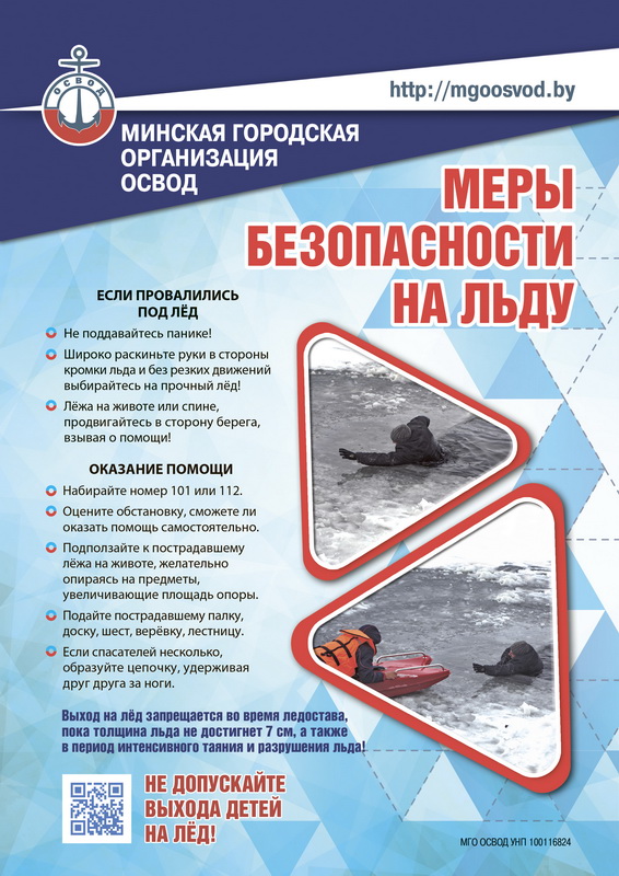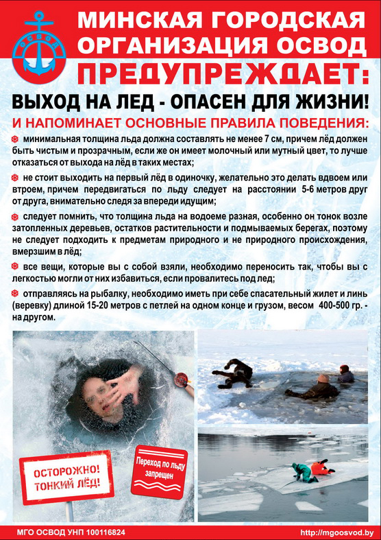 В государственном предприятии «Минский метрополитен» организована информационная работа по разъяснению работникам правил безопасного поведения на льду. Особый акцент сделан на доведение необходимой информации до семей сотрудников, в которых воспитываются несовершеннолетние дети. По просьбе руководства РО ОСВОД Московского района Минска, напоминаем основные правила безопасности на льду.