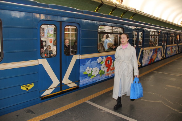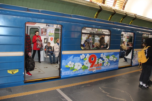 Это уже стало хорошей традицией столичной подземки – брендировать вагоны некоторых составов к Великому всенародному празднику. На них изображены известные каждому гражданину нашей страны цифры и даты – 9 мая и 1941-1945, на фоне цветущих яблоневых веток.