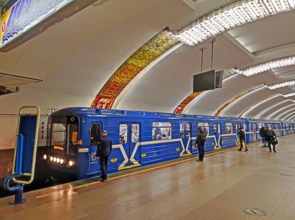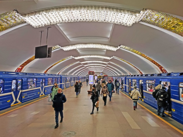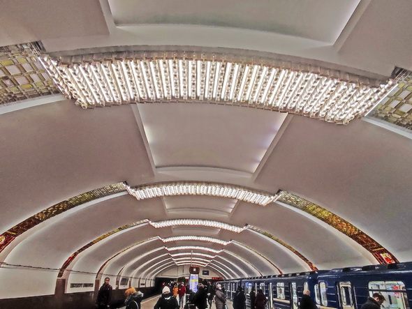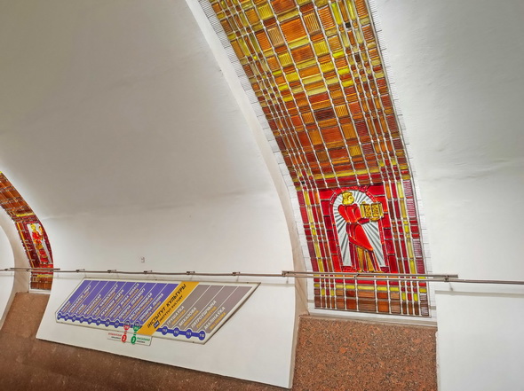 Основную художественную нагрузку здесь несет как раз свод, прорезанный в определенном ритме падугами, – 12 арок, опоясывающих легкий свод подземного дворца. Полосы напоминают белорусские рушники. Вставки из литого стекла выполняли мастера стеклозавода «Неман». Ближе к центру свода они заменены люстрами из хрустального стекла, отлитыми на Борисовском заводе.