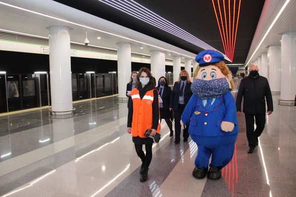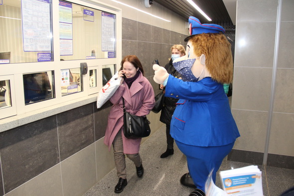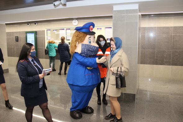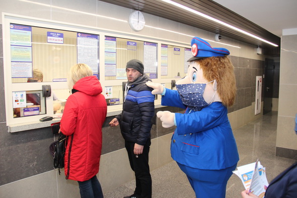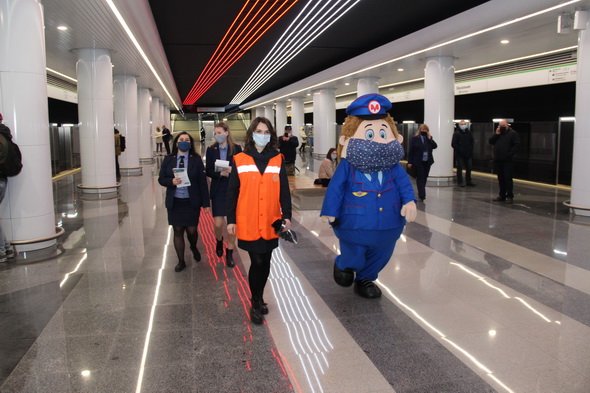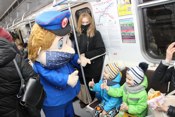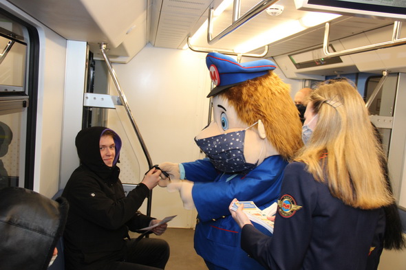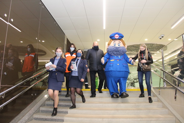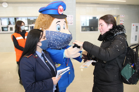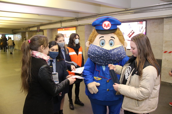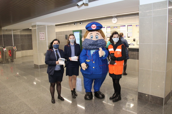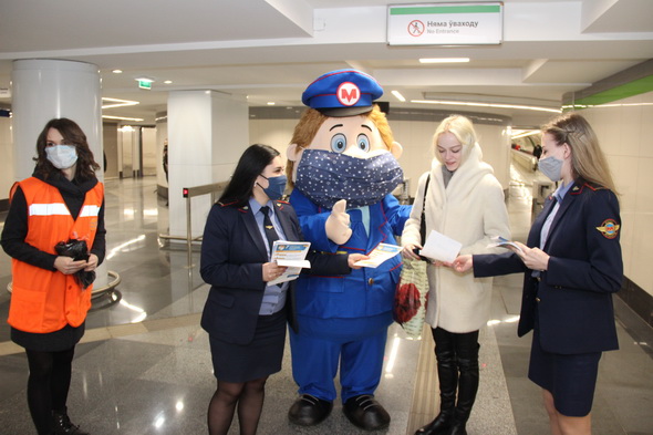 Работники подземки объясняют пассажирам важность соблюдения обязательного масочного режима не только в метро, но и во всем городском общественном транспорте. В этом им активно помогает анимационный персонаж Метрович. На время акции он надел большую повязку, чтобы даже своим внешним видом показывать всем пример.