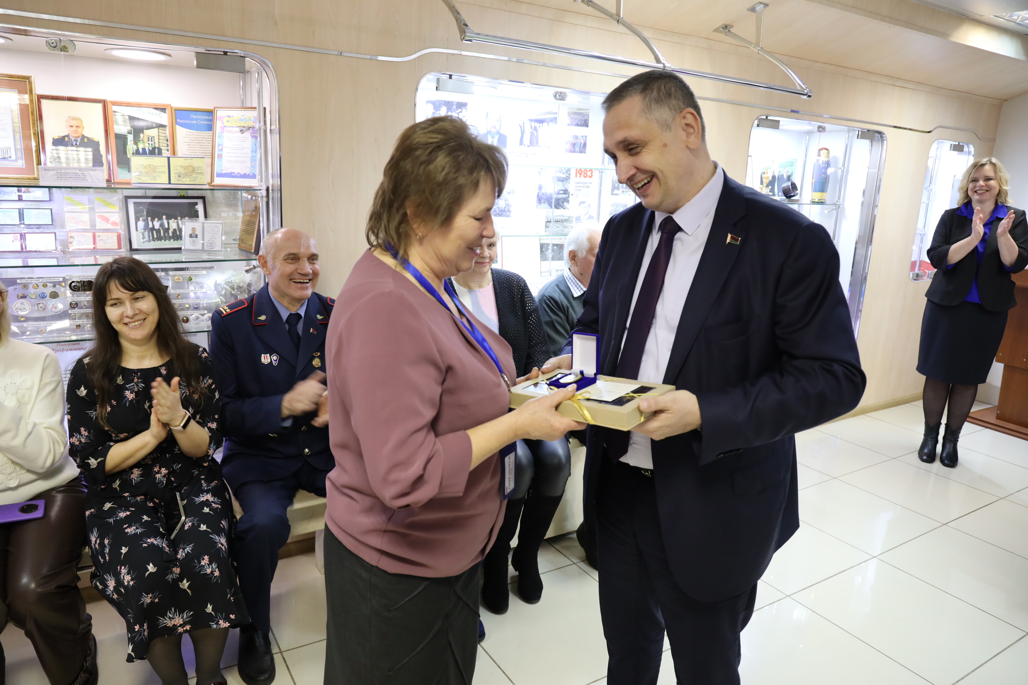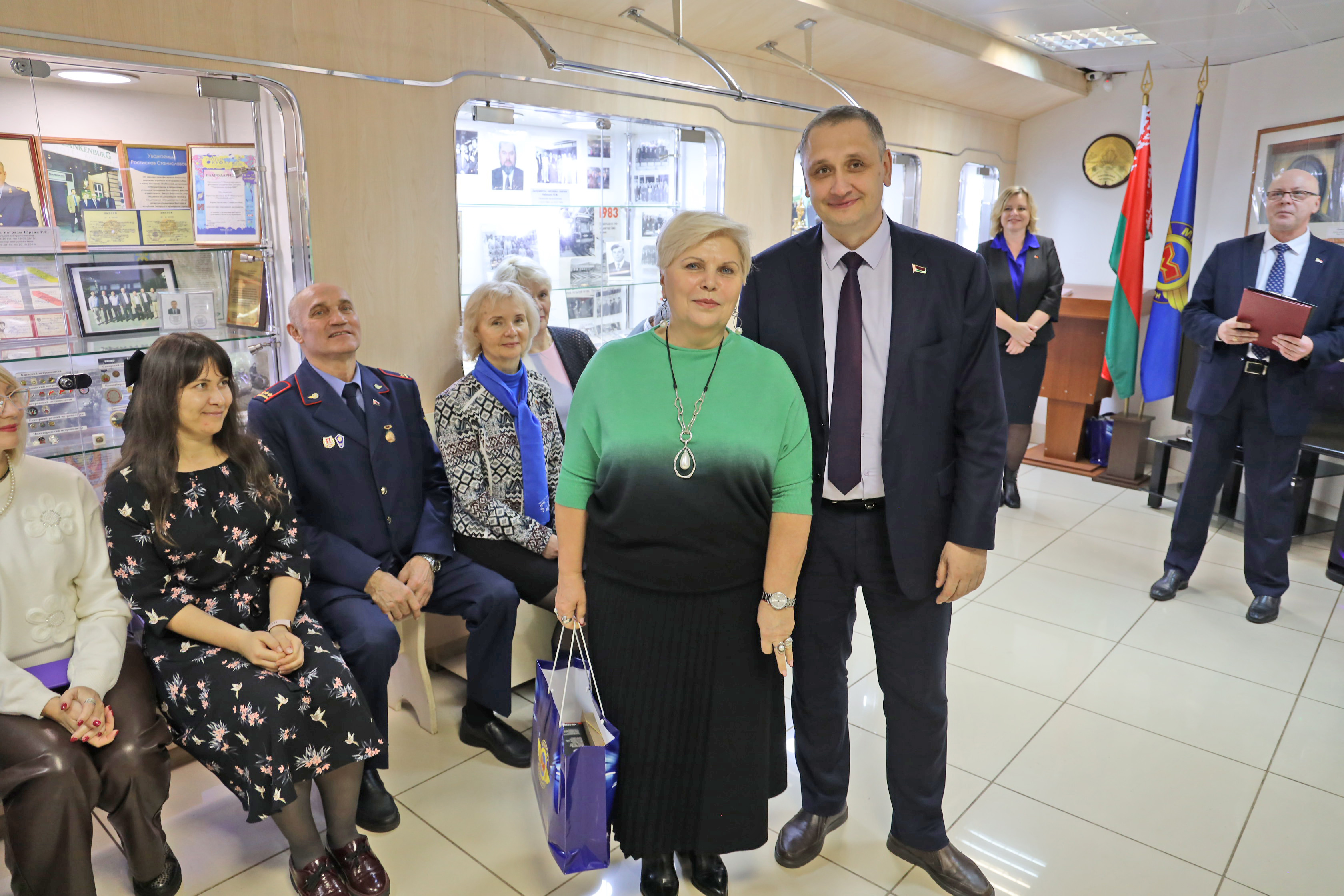 Алексей Шилов вручил Григорию Якимкову и Елене Карасик подарки, поблагодарил за сохранение бесценной истории метрополитена. А Ирине Омельчук Алексей Сергеевич вручил нагрудный знак отличия «За заслуги» и подарок.