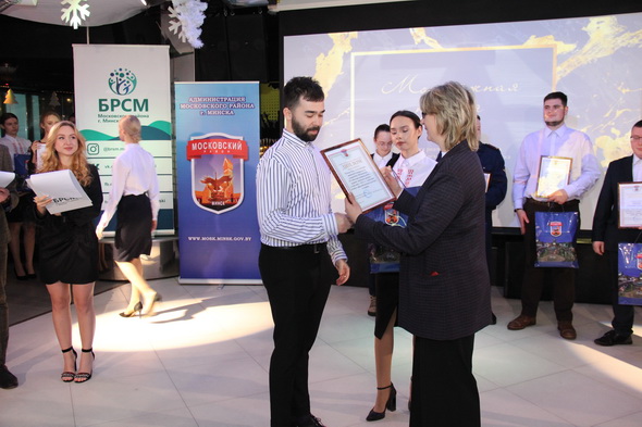 Как отметил первый секретарь БРСМ Московского района Константин Андрусевич, в награждении приняли участие более 300 молодых людей. Они в канун Нового года получили заслуженные награды – грамоты и благодарности, ценные призы. Были отмечены лучшие трудовые штабы, студенческие отряды, их руководители и бойцы. Также чествовали в различных номинациях лидеров среди работающей молодежи.
