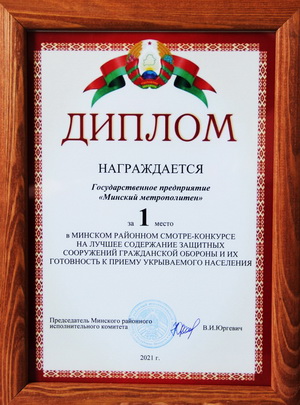 По его итогам защитное сооружение государственного предприятия «Минский метрополитен» признано лучшим в Минском районе. Данный результат был достигнут, благодаря эффективной работе, проведенной в период подготовки к смотру-конкурсу сотрудниками дистанции спецобъектов электромеханической службы. Много сил и усердия к этой победе приложили представители данного подразделения: его начальник Александр Цапков, старший мастер Дмитрий Здоровиков, инженер Анжелика Доманова и старший электромеханик Дмитрий Шутько.