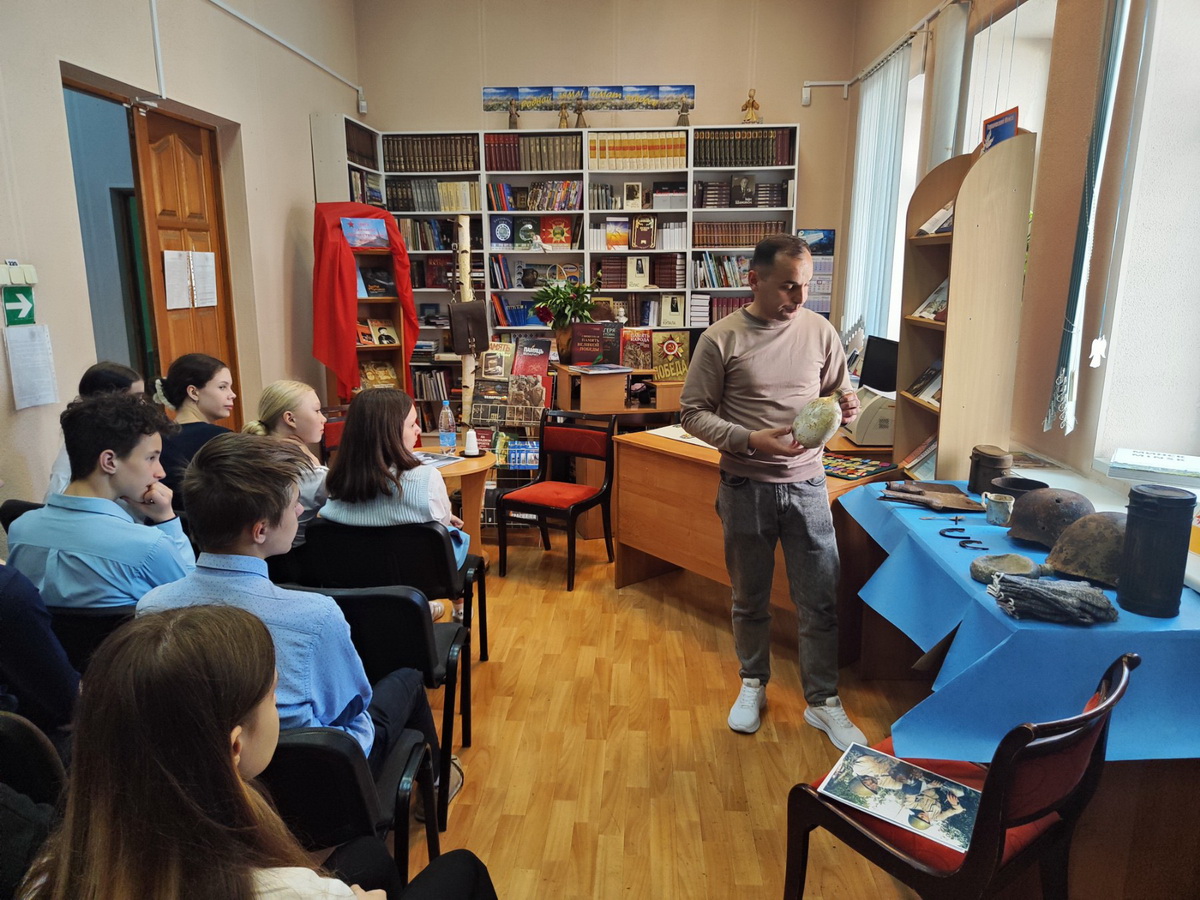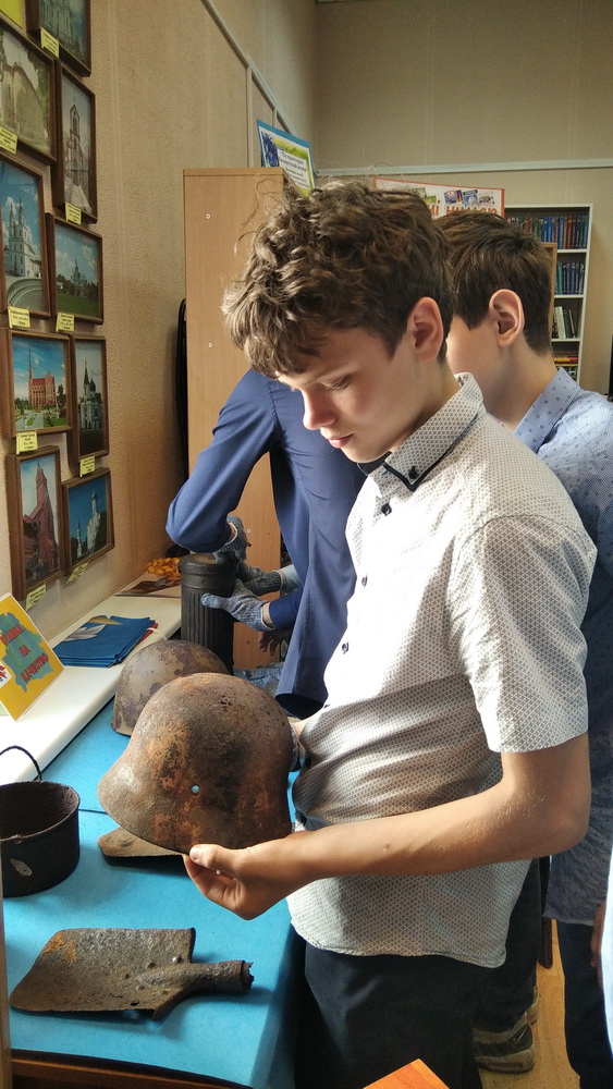 Во время урока мужества молодежь смогла не только послушать интересные факты о событиях Великой Отечественной войны и наших земляках-героях, но и более детально ознакомиться с экспонатами, поддержать их в руках.
