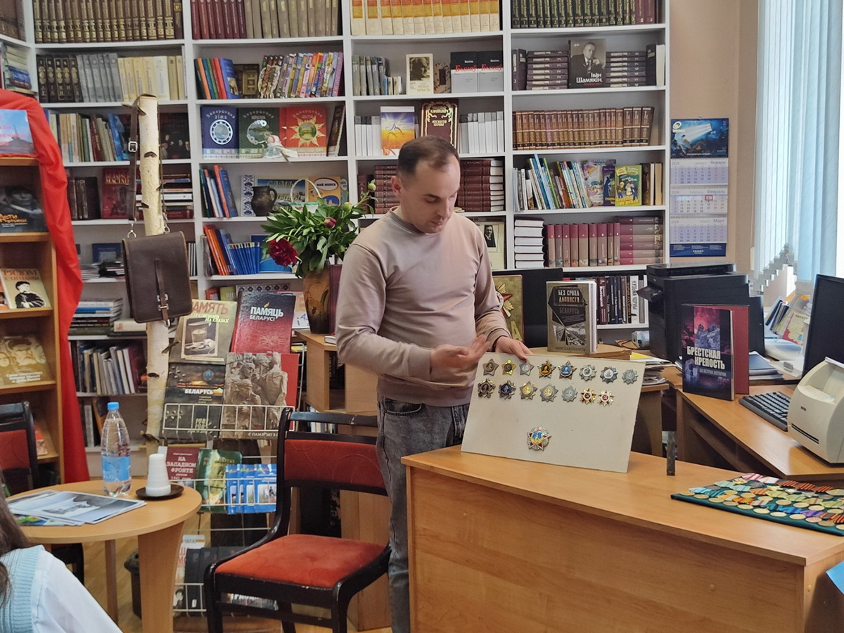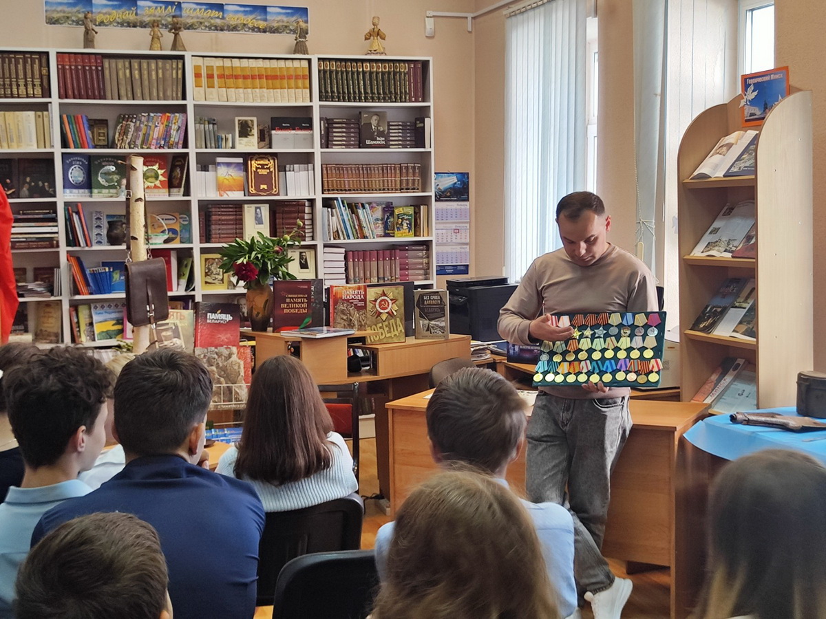 Перед учащимися выступили председатель гражданско-патриотического клуба «Памяць» О.В.Коховец и его заместитель А.Е.Крышнёв. Они рассказали молодежи об известных белорусах – участниках Великой Отечественной войны, отмеченных высокими государственными наградами за проявленные мужество и героизм в борьбе с немецко-фашистскими оккупантами. Кроме того, О.В.Коховцом были продемонстрированы собранные в ходе работы клуба экспонаты: предметы экипировки солдат военной поры, а также муляжи государственных наград советского периода. О них выступающий рассказал много интересного.