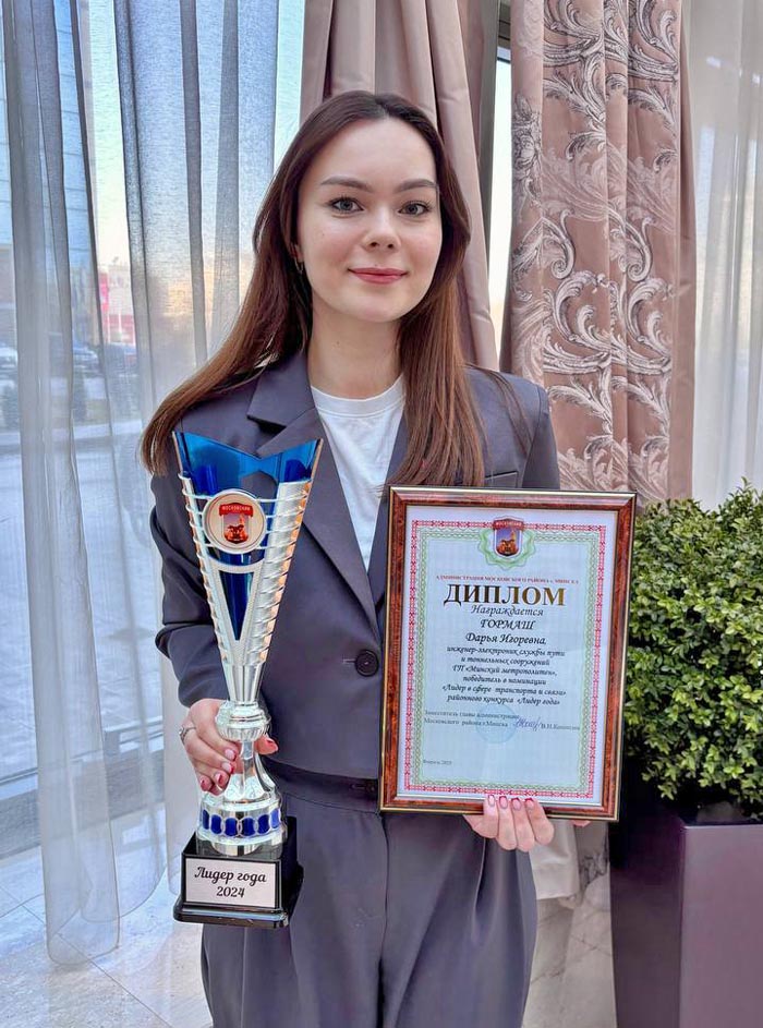 Инженер-электроник техотдела службы пути и тоннельных сооружений государственного предприятия «Минский метрополитен» Дарья Гормаш стала победителем районного конкурса «Лидер года-2024» в номинации «Лидер в сфере транспорта и связи».