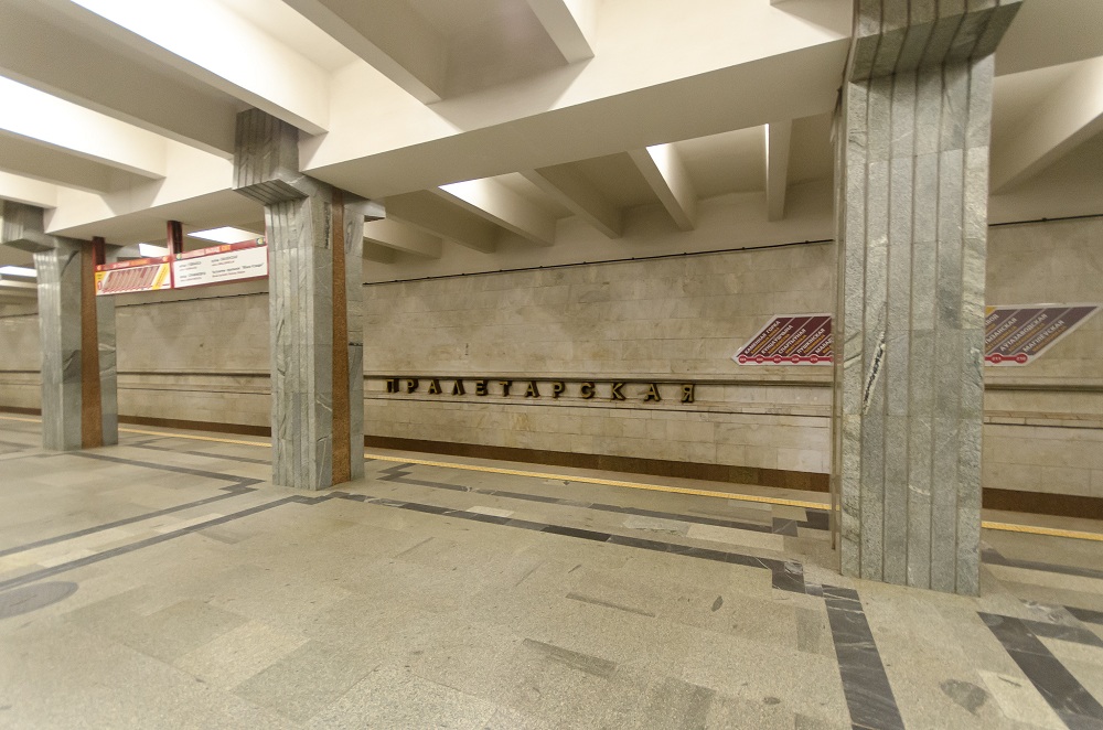 «Пролетарская» – это колонная станция мелкого заложения, трехпролетная, с двумя вестибюлями (сегодня эксплуатируется только западный). С момента открытия станции в 1990 году восточный вестибюль никогда не эксплуатировался. В условиях местной застройки (плотно стоящие пятиэтажные дома, узкая проезжая часть улицы Судмалиса), а также из-за отсутствия значимых объектов, в настоящее время этот выход не эксплуатируется.