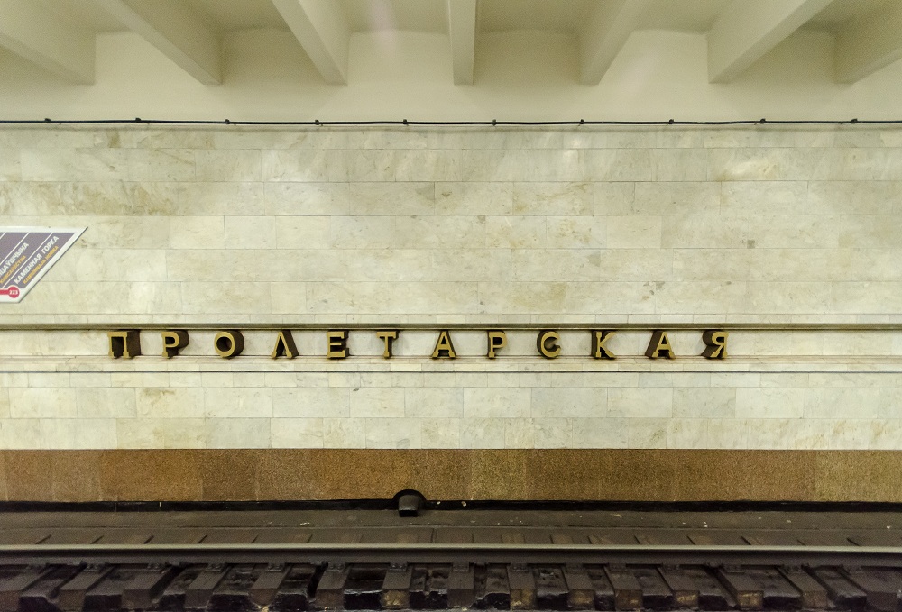 Оформление станции метро «Пролетарская» подчинено идее трудовой доблести. Колонны стилизованы под руки рабочих, поддерживающие несущие балки перекрытия. Важный элемент платформенной части – скульптура рабочего-метростроителя, созданная скульптором Н.Рыженковым. Сдержанные светло-серые тона гранита и мрамора с небольшим вкраплением красного цвета создают на станции образ трудового подвига народа.